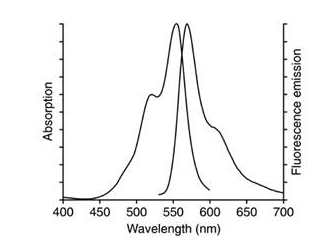 DiI即DiIC18(3),全稱為1,1'-dioctadecyl-3,3,3',3'-tetramethylindocarbocyanineperchlorate,是最常用的細(xì)胞膜熒光探針之一,呈現(xiàn)橙紅色熒光。DiI是一種親脂性膜染料,進(jìn)入細(xì)胞膜后可以側(cè)向擴(kuò)散逐漸使整個(gè)細(xì)胞的細(xì)胞膜被染色DiI在進(jìn)入細(xì)胞膜之前熒光非常弱,僅當(dāng)進(jìn)入到細(xì)胞膜后才可以被激發(fā)出很強(qiáng)的熒光。DiI被激發(fā)后可以發(fā)出橙紅色的熒光,DiI和磷酯雙層膜結(jié)合后的激發(fā)光譜和發(fā)射光譜參考下圖1。其中,最大激發(fā)波長(zhǎng)為549nm,最大發(fā)射波長(zhǎng)為565nm。