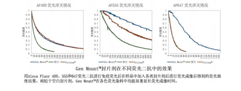 Gen Mount?系列產(chǎn)品是本公司自主研發(fā)的封片劑產(chǎn)品,本產(chǎn)品在延緩熒光淬滅速度,提高熒光亮度和熒光樣品保存方面具有優(yōu)異的性能。其中,Gen Mount? Top 系列為通用型封片 劑,能夠搭配 Gen Fluor?系列熒光二抗,Alexa 系列熒光染料等使用,能夠明顯延長(zhǎng)熒光成像 時(shí)間。Gen Mount? Bright 是為傳統(tǒng)染料 FITC,TRITC 等開(kāi)發(fā)的封片劑。 Gen Mount?系列產(chǎn)品折光率為 1.40。