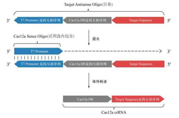 Cas12a crRNA 轉(zhuǎn)錄原理示意圖如圖 1 所示,試劑盒中已提供 Cas12a Sense Oligo,只需根據(jù)待測目標(biāo)序列設(shè)計(jì) Target Antisense Oligo。
