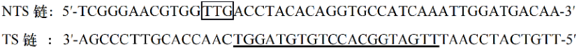 其中灰色部分表示 T7 Promoter 反向互補(bǔ)序列,波浪線部分為 Cas12a DR 反向互補(bǔ)序列,兩者均為固定序列。下劃線部分為 Target Sequence。